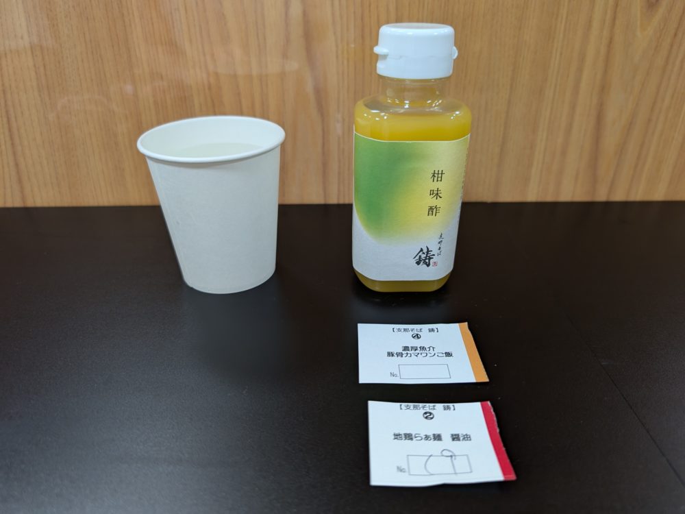 ラーメンを待っている間、こちらの柑味酢が置いてありました。