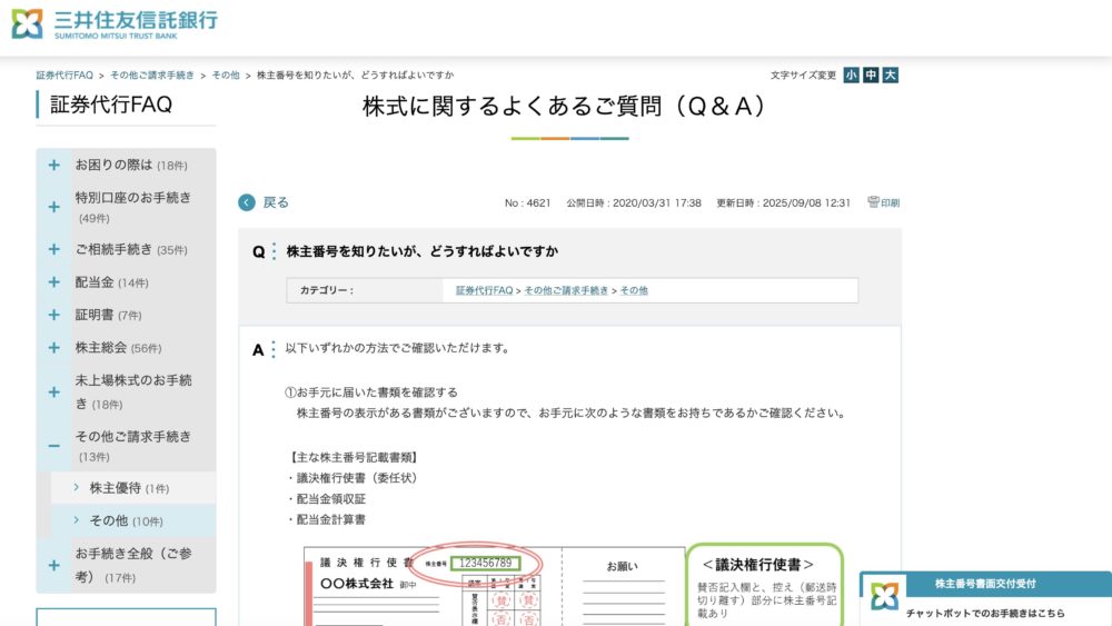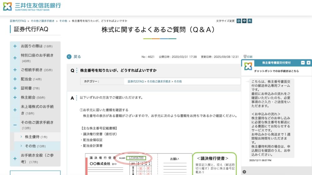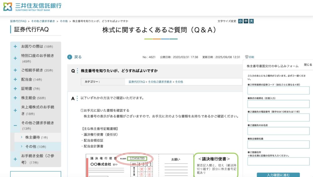 →「株主番号を確認できる書類がお手元にない場合は、三井住友信託銀行証券代行部までご連絡ください。」と。